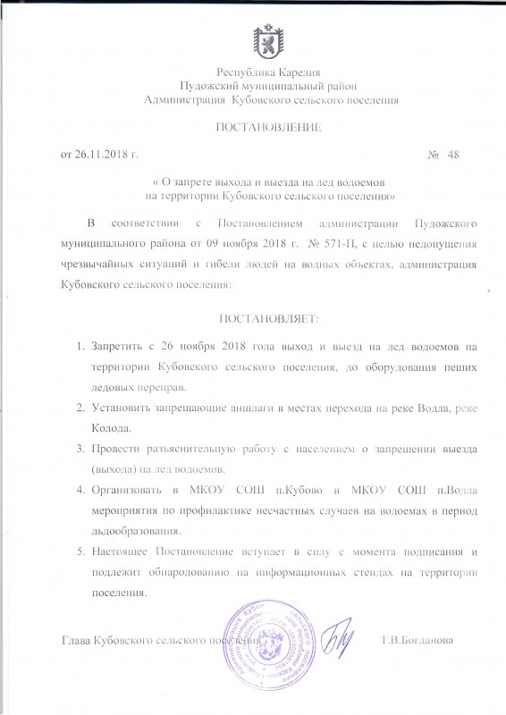 | 3 | Постановление | 48 | 26.11.2018 | О запрете выхода и выезда на лед на территории Кубовского сельского поселения |
